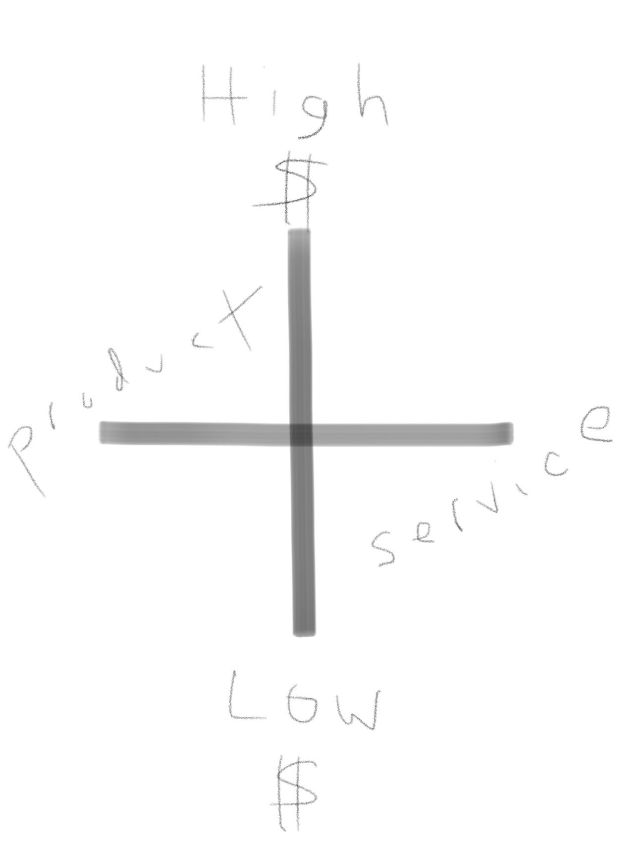 Let explain my poorly drawn graphic: From left to right on the x-axis, we have “products” on one end and “services” on the other. From top to bottom on the y-axis, we peak at “high-priced” and drop to “low-priced.”***