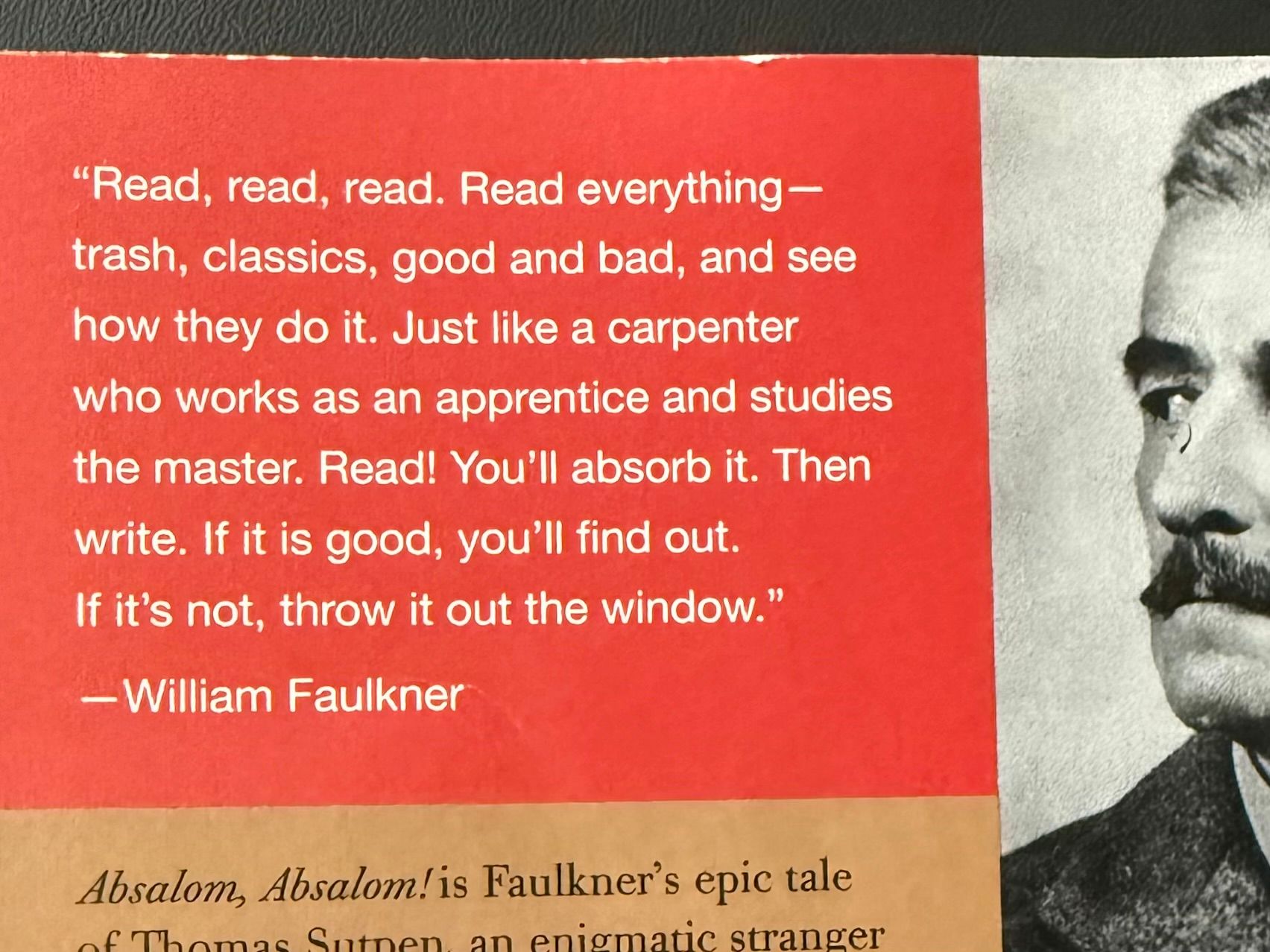 What year did Faulkner write that blurb? It doesn’t matter. All that actually matters is that he knew it too, and this book didn’t come about because he was sitting around scrolling social media, he was consuming his way through apprenticeship and my god does it show on those pages.