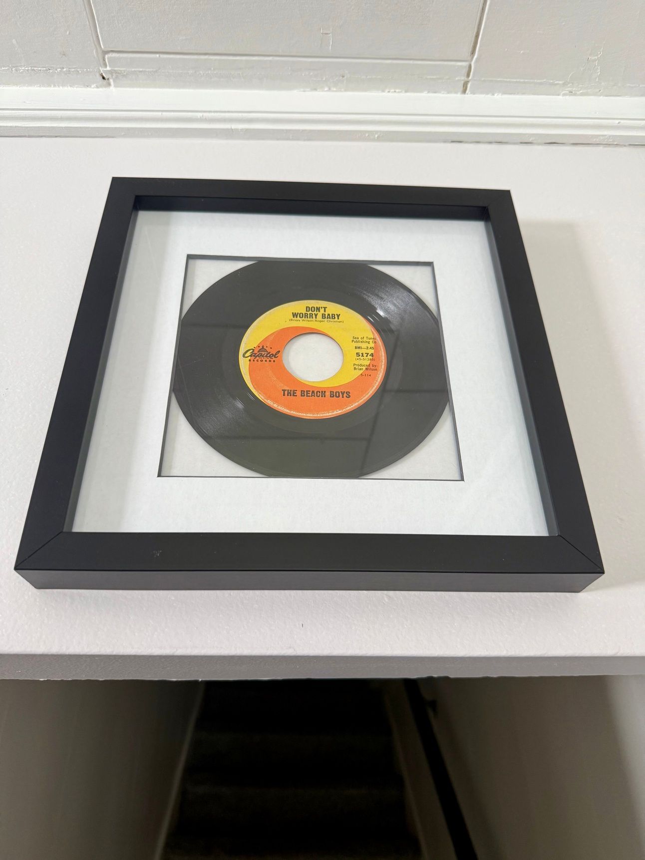 A few years ago, I bought my wife a 45/single of “Don’t Worry Baby” and framed it. That’s it in the picture, hanging above the entry to our staircase in our kitchen. I look at it every night before I walk upstairs to bed. It’s a reminder of the language my wife and I share. It’s a reminder that great art turns weights into wings.